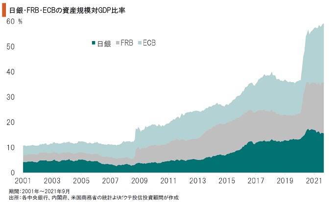 リーマンショック、新型コロナ禍への対応で、日銀、FRB、ECBは大規模なマネーの供給を行ってきた。その結果、リーマンショック以前にGDPの10%程度だった3中央銀行の資産規模は、足下、59.2%へと膨張している。経済規模に対する大量の供給は、中長期的に通貨価値を下落させる可能性が強い。特に日銀の資産規模対GDP比率は130.2%で突出している。