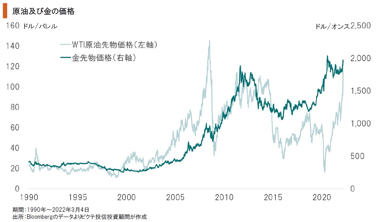 世界最大級の資源国ロシアによるウクライナ危機が、泥沼化する可能性は否定できない。原油、天然ガスの価格は上昇し、地政学及びインフレ、いずれのリスクにも強い金が買われている。ウクライナにおける戦闘が小康状態になっても、ウラジミール・プーチン大統領の下ではロシアの国際社会への復帰は長期的に難しく、商品価格は趨勢的な上昇が予想される。