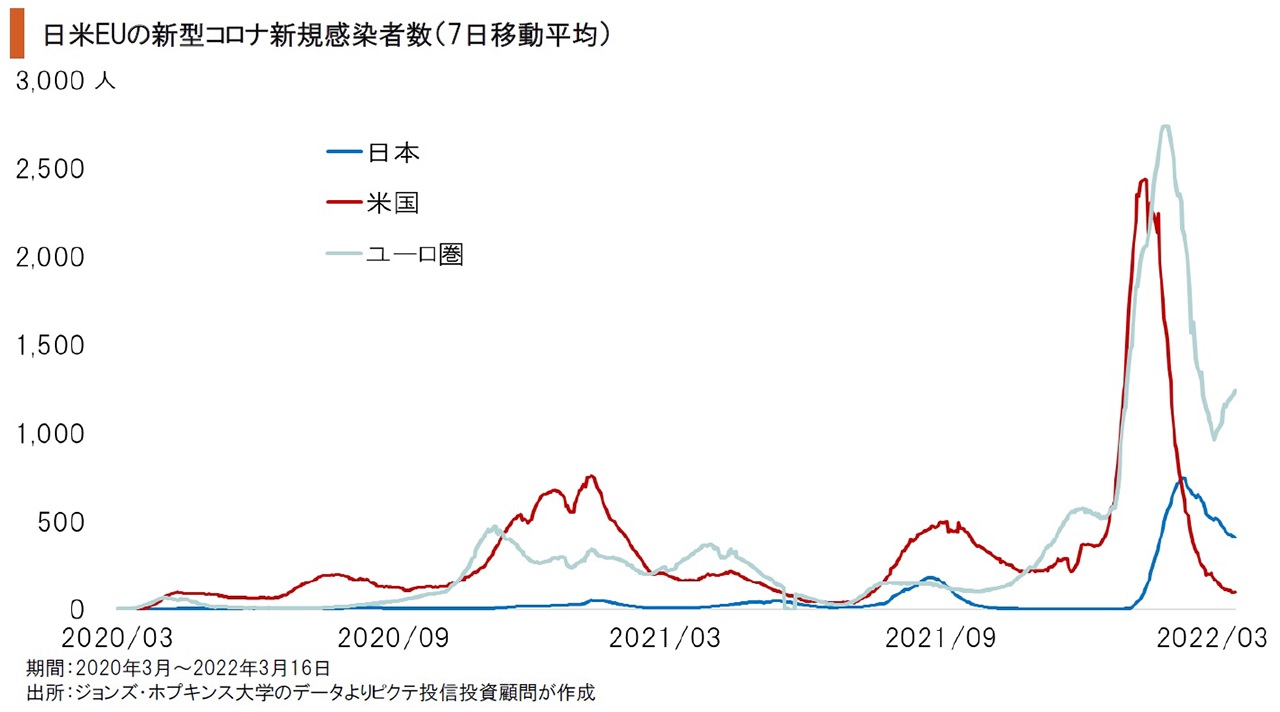 国際社会、そして市場の注目はウクライナ危機の衝撃に注がれているが、2020年の年初から2年以上に亘り世界を苦しめてきた新型コロナ禍への主要国の政策対応に明らかな変化が見られるようになった。各国政府は、社会・経済の正常化へ向け舵を切りつつある。日本においても、18都道府県に発令されていた蔓延防止等重点措置が、3月21日をもって全面的に解除された。昨年末から今年に入っての世界的な感染拡大期の特徴は、感染の過半を占めるオミクロン型の強い感染力、そして病原性(≒毒性)の弱化によるものだろう。重症化率、致死率は明らかに低下、医療供給体制が維持されたことで、重篤な感染者への適切な医療の提供が可能になりつつある。また、主要国においてワクチン接種が進んだことも、重症化の抑制に大きく貢献しているのではないか。さらに、処方が開始された軽症者向けの経口治療薬が普及すれば、”zero Corona”は不可能としても、”with Corona”の下で社会・経済活動は新たな「平時」へと回帰するだろう。この冬の世界的な感染拡大の波が収まりつつあることは、新型コロナ禍が大きな転換点を迎えた可能性を示していると考えられる。