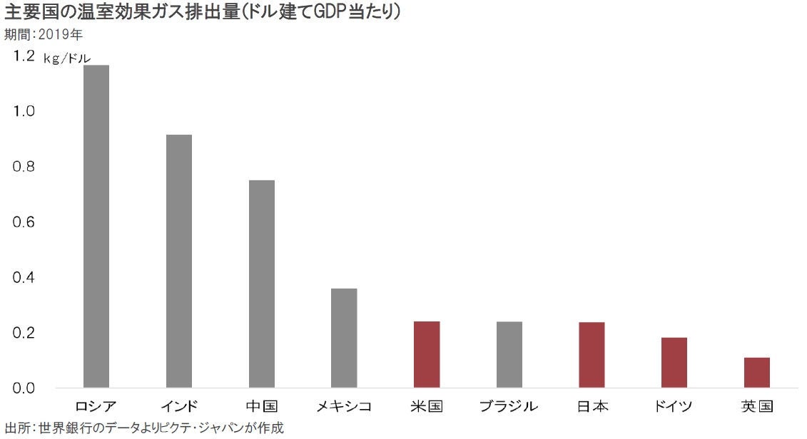 原単位方式、即ちGDP1ドルを得るに当たって排出される温室効果ガスは、足下、米国、日本が共に0.24kgなのに対し、ロシアは1.17kg、インド0.91kg、中国は0.75kgだ。つまり、同じ付加価値を生み出すのに、中国は米国、日本の3倍の温室効果ガスを排出しなければならない。西側先進国の立場から見れば、温室効果ガスの排出量を減らす上で、新興国・途上国による持続的な努力が必須だろう。