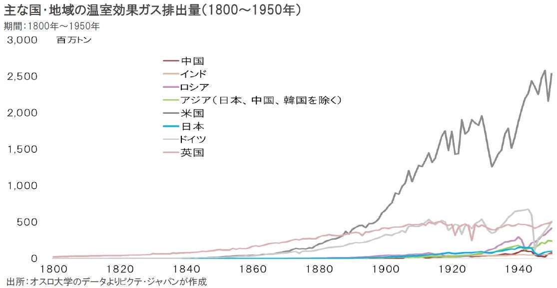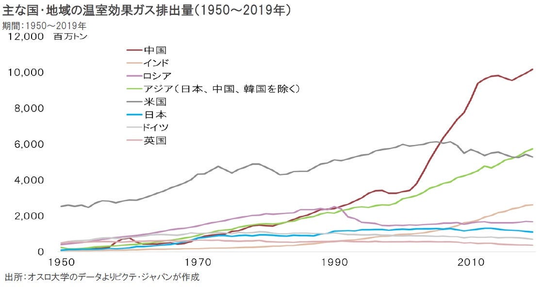 旧ソ連の崩壊により、米国主導の下、世界のサプライチェーンの統合が進んだ。その結果、教育水準が高いにも関わらず、労働コストが相対的に低かったASEAN諸国、中国、メキシコなどが工業化、対先進国向け輸出により高度経済成長期に入った。従って、近年における温室効果ガスの排出拡大は、概ね新興国が要因となっている。一方、成長が減速した先進国は、排出量も概ねピークアウトした。