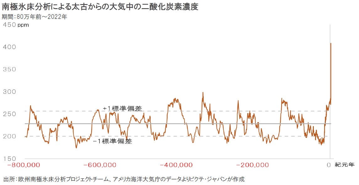 南極で掘削された氷柱の分析から、過去80万年間に10万年を周期とする8回の氷河期と間氷期のサイクルがあり、大気中の二酸化炭素濃度は228ppmを中心に200〜260ppmの範囲で循環していたことが判明した。米国海洋大気庁によれば、2022年の二酸化炭素濃度は418ppmに達している。18世紀半ばからの産業革命以降の影響による異常値であり、地球環境に与える負荷は極めて大きいだろう。