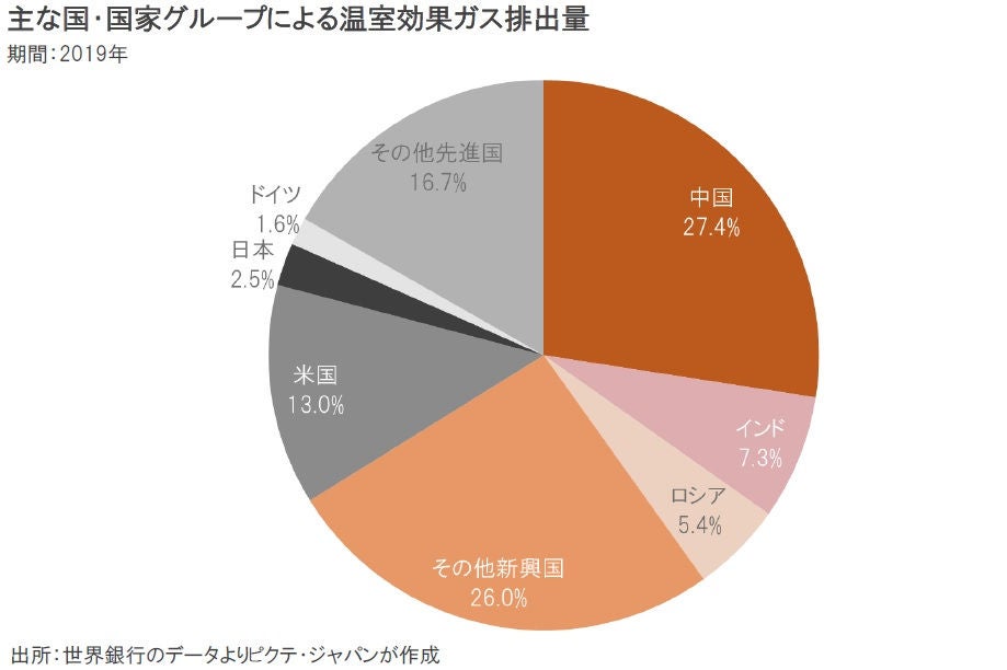 2019年における温室効果ガスの排出量は、中国が全世界の27.4%を占め、インド、ロシアなど他の新興国・途上国を合わせて66.1%に達していた。気候変動に関し、新興国・途上国の重要性が高まっているのはこのためだ。特に新興国は、旧ソ連が崩壊した1991年以降、急速に進む工業化のなか排出量が大きく増加した。グローバリゼーションの負の側面と言えるだろう。