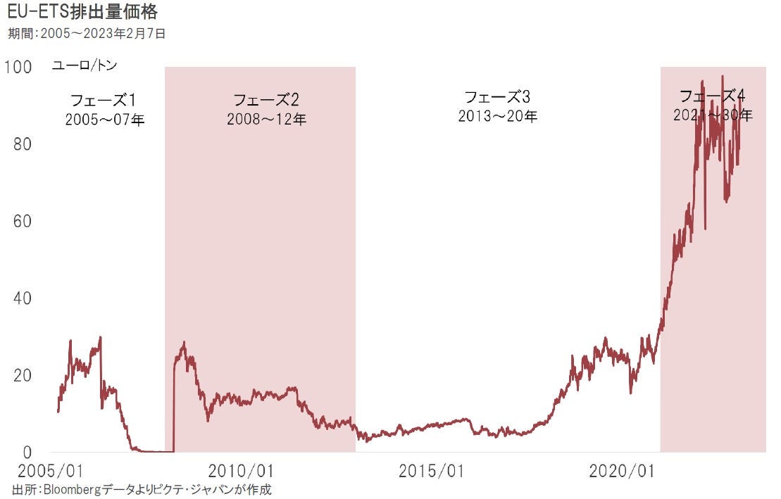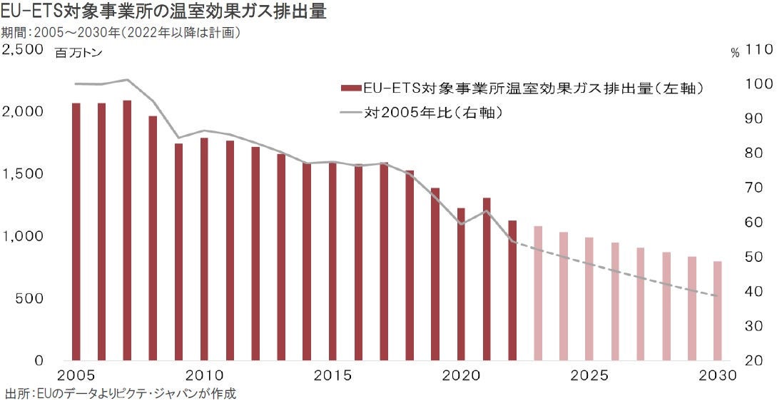 EUは2005年に排出量取引を開始したが、2010年代はリーマンショック、欧州通貨危機により景気が停滞、対象事業所の多くが削減目標達成にメドを付け、価格は低迷した。しかし、2019年12月に就任したEU委員会のウルズラ・フォンデアライエン委員長の下、2030年までの削減目標を1990年比で従来の40%から55%へ引き上げたことにより、価格が急騰、その後も高水準での推移が続いている。