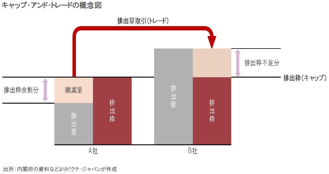 EUの排出量取引市場は「キャップ・アンド・トレード」と呼ばれる方式を採用した。これは、温室効果ガスの排出量が多い業種を指定、各事業所毎に排出量の上限(キャップ)を設ける仕組みだ。ある事業所の実際の排出量がキャップを下回れば、その余剰部分を市場で売却することができる。一方、排出量がキャップを上回った事業所は、市場において排出量を購入、いわば罰金を払わなければならない。
