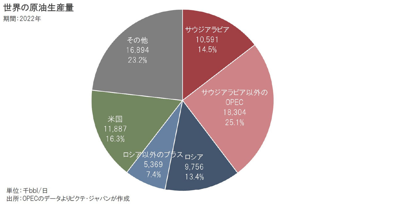 現在の3大産油国は、サウジアラビア、ロシア、そして米国であり、この3ヶ国で世界の44%を供給している。米国はそれでも純輸入国であり、純粋な産油国、そして原油輸出国の枠組みとしては、1960年に設立されたOPECが挙げられるだろう。さらに、近年は原油の供給調整を行う枠組みとしてOPEC+への注目度が高まった。世界の原油生産の60%を賄うが、サウジアラビアとロシアがその半分弱を占める。