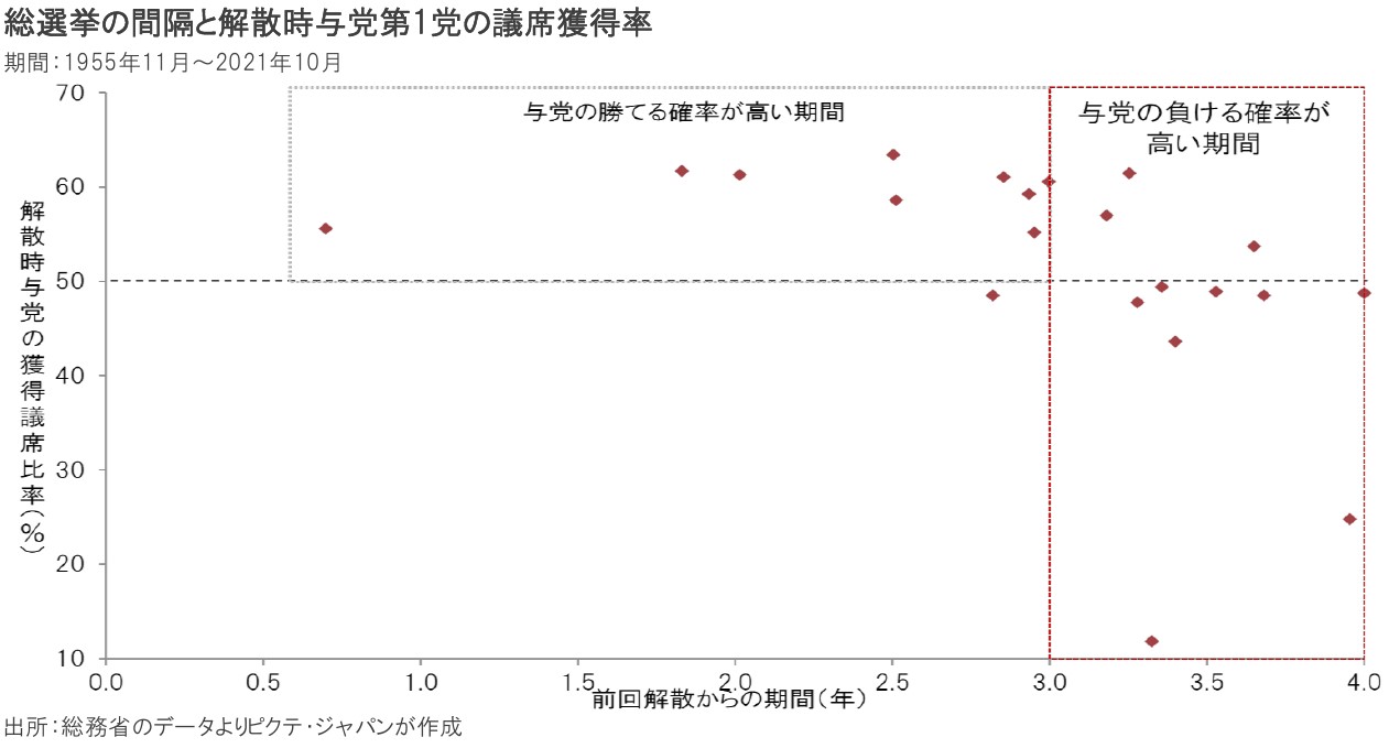 1955年11月に自民党が結党されて以降、総選挙は22回あった。このうち、前回の総選挙から3年以内に行われた10回のうち、9回で解散時与党第一党が過半数を維持した。一方、3年超で行われた12回では、うち8回で解散時与党第一党は過半数割れした。衆議院の任期は4年間だが、内閣総理大臣にとって、解散・総選挙は3年以内のインターバルで実施するのが鉄則と言えるだろう。