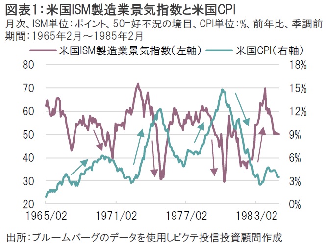 1970年代前後では米CPIが上昇トレンドに入ると米ISM製造業が下降トレンドに入る傾向に