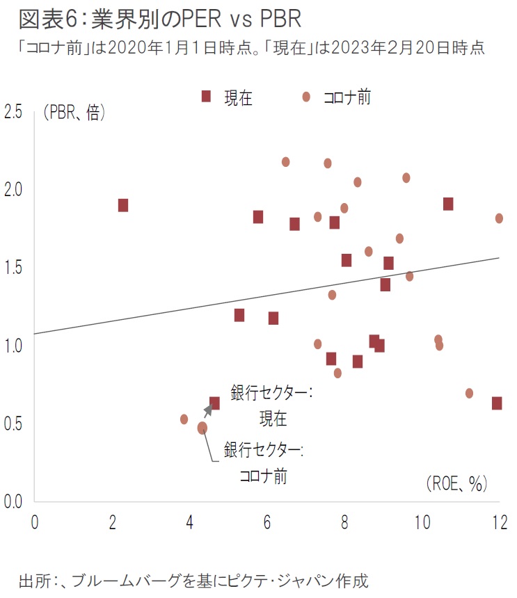 なお、現在の銀行株は、他の業界と比べても依然割安である。現在の銀行株のROE(株価収益率)とPBRの関係を見ると、コロナ直前の2019年末時点からはわずかに改善しているものの、主要業界の中ではまだ大きくディスカウントされている(図表6)。地銀の中には、依然として、PBRが0.2倍台の銘柄も多く、極端な割安に放置されているものが存在していることがここにも表れている。