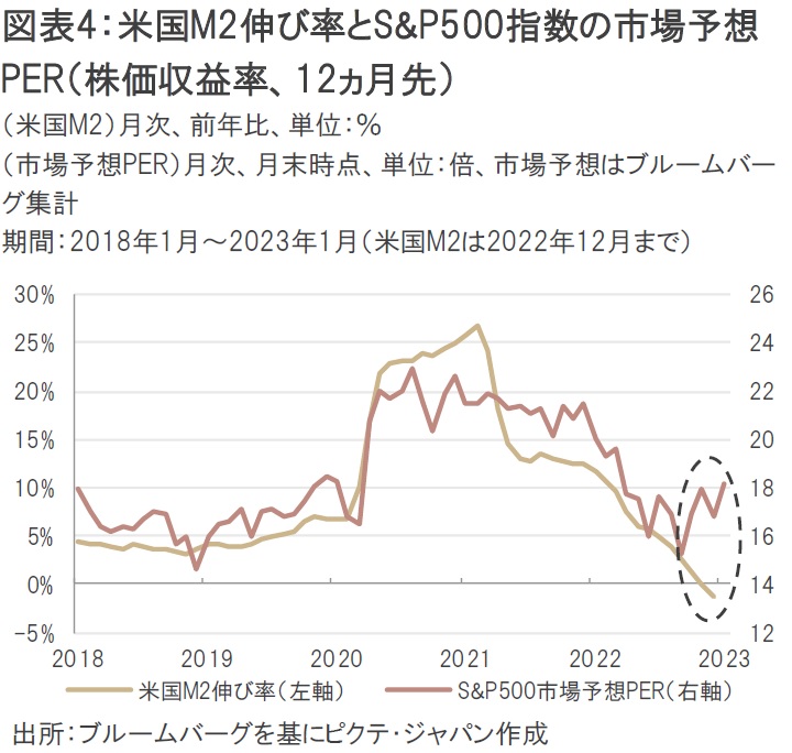 米国M2の縮小が米国の景気後退を引き起こす前提条件ではないと分かっても、M2の伸び率はS&P500指数の市場予想PER(株価収益率、12ヵ月先)に影響を及ぼす傾向があるため油断はできない。米国M2の伸び率が2020年2月時点の前年比+6.8%から2020年8月時点の同+23.0%へ急加速した際、S&P500指数の市場予想PERは16.8倍から22.9倍へ急上昇していた。反対に、FRBが金融引き締めに転じ、米国M2の伸び率が2021年12月時点の同+12.4%から2022年9月時点の同+2.6%へ急減速した際は、S&P500指数の市場予想PERは21.4倍から15.3倍へ急低下していた(図表4)。