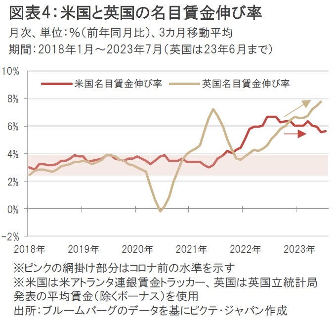 FRB(米連邦準備制度理事会)の金融政策を見通す上でヒントになりうるのが、名目賃金伸び率の動向だ。労働集約的なサービス業のインフレを抑制するには、名目賃金の伸び率を鈍化させる必要があるからだ。英国ではこの名目賃金が上昇傾向にあり、米国では概ね高止まりの状態にある(図表4)。