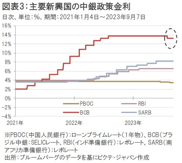翻ってブラジルはどうだろうか?ブラジルでは21年前半からインフレ率が上振れ始めたとは言え、BCBは21年3月から主要中銀に先駆けて利上げを開始、政策金利を21年1月時点の2.00%から22年8月時点の13.75%まで一気に11.75%も引き上げた(図表2、3)。