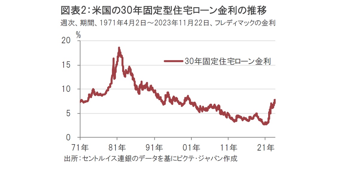 米連邦準備制度理事会(FRB)の利上げを受け、住宅ローン金利が歴史的な上昇局面に転じた時期に(図表2参照)、中古住宅と新築住宅の販売の方向性に違いがみられました。この背景として、報道では住宅の供給不足や、中古住宅の在庫不足を指摘しています。住宅建材価格の高騰や建築作業員の人手不足が住宅供給の足かせとなったと考えられるからです。また、別の原因として住宅保有者が住宅市場での売却を控える「ロックイン効果」も指摘されています。