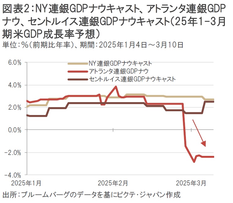 米アトランタ連銀が算出するGDPナウ(25年1-3月期米GDP成長率の予測値)は、2月28日時点で+2.3%から-1.5%へと3.8%ポイントも下方修正されていた(図表2)。これにより、堅調な経済成長を期待していた投資家は、突然の予測変更に不意を突かれる形となった。トランプ大統領のインタビューは、こうした景気後退懸念をさらに強めるきっかけに過ぎなかった。