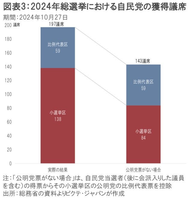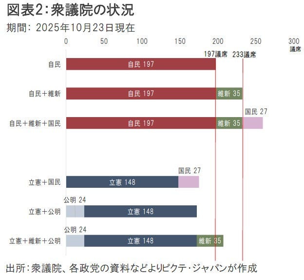 仮に維新の会が政権を離脱、立憲民主党、公明党と協調した場合、衆議院において自民党の議席数を凌駕し、内閣不信任案が成立しかねない(図表2)。また、事態を打開するため高市首相が衆議院を解散する手はあるものの、公明党との選挙協力がないなかで、自民党が苦戦を強いられるシナリオは十分に起こり得る(図表3)。