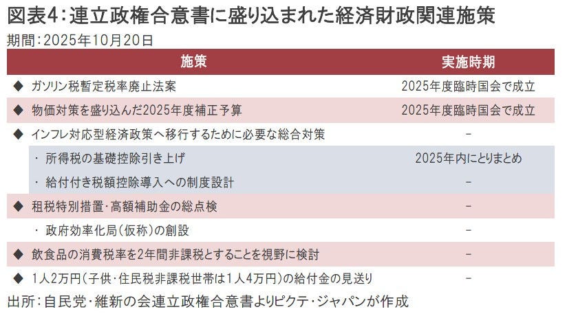 高市政権の当面の経済政策については、維新の会と取り交わした『連立政権合意書』が基本的な指針となる見込みだ。「経済財政関連施策」には、大枠として6項目が記されていた(図表4)。このうち、特に重視されるのは、立法化の時期を今臨時国会中と明記したガソリン税暫定税率の廃止、物価対策を盛り込んだ2025年度補正予算だろう。また、「インフレ対応型の経済政策に移行するために必要な総合対策を早急にとりまとめる」とあり、具体的には所得税基礎控除の引き上げに関して、制度設計を「年内」に行うとされた。
