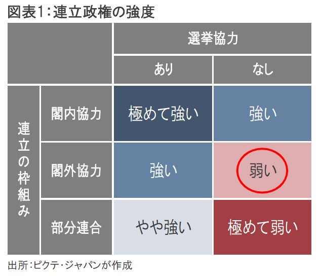 連立政権の大前提は政策合意である。その上で連立の強度を決めるのは、枠組み、そして選挙協力の有無の2つだろう(図表1)。枠組みについては、閣内協力、閣外協力、政策毎に是非を判断する部分連合の3つが存在する。