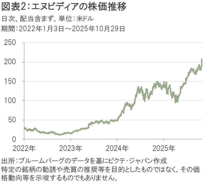 米国株式市場では、2022年11月30日の生成AI「ChatGPT」公開以降、AI半導体大手のエヌビディアを中心に大手AI関連企業が上昇相場を牽引してきた。この約3年を「AI相場1.0」と位置づければ、今後はAI関連企業の循環投資が上昇相場を牽引する「AI相場2.0」への移行が始まりつつあると考えられる(図表1、2)。
