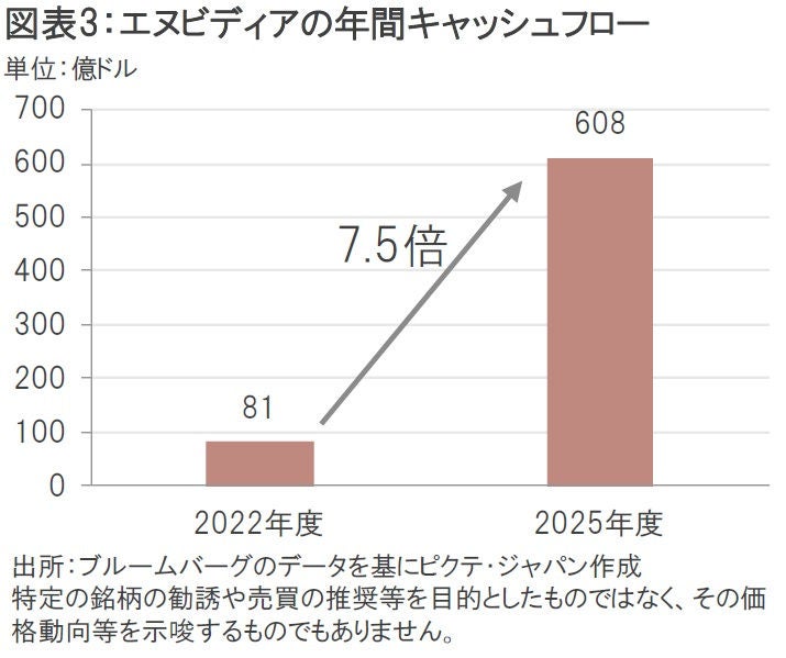 エヌビディアの資金力は飛躍的に高まっている。時価総額は5.0兆ドルに達し、年間フリーキャッシュフローは2022年度の81億ドルから2025年度には608億ドルへ約7.5倍に急増した(図表3)。