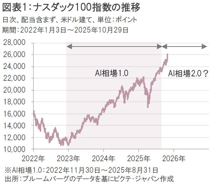 米国株式市場では、2022年11月30日の生成AI「ChatGPT」公開以降、AI半導体大手の米エヌビディアを中心に大手AI関連企業が上昇相場を牽引してきた。この約3年を「AI相場1.0」と位置づければ、今後はAI関連企業の循環投資が上昇相場を牽引する「AI相場2.0」への移行が始まる可能性がある