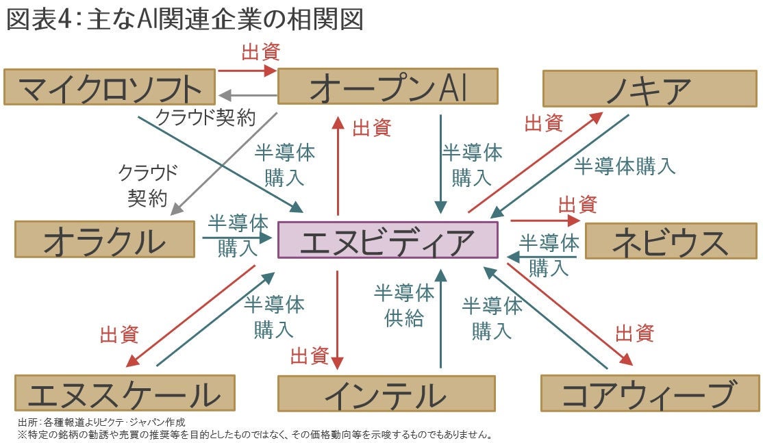 さらに、エヌビディアは米半導体大手インテル、フィンランドの通信機器大手ノキア、AIクラウドサービスのスタートアップである米コアウィーブ、英エヌスケール、オランダのネビウスなどにも出資している。いずれもエヌビディアのAI半導体を購入する企業であり(インテルはx86 CPUの開発・供給で関与)、この構図はITバブル期に見られたベンダーファイナンス――顧客に対して自社製品の購入資金を提供する手法――に近いとの指摘も出ている(図表4)。