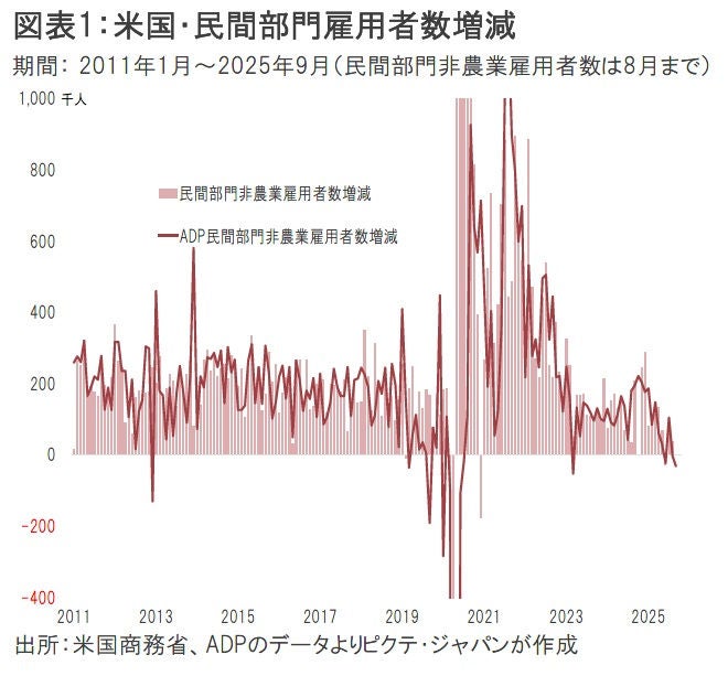 政府による経済指標の発表が極めて限られるなか、米国景気の現状を探るには、民間の統計に頼らざるを得ない。代表的な指標は、オートマティック・データ・プロセッシング社(ADP)が集計する民間雇用者数だ。労働省の雇用統計における非農業雇用者の約20%をカバーしており、両指標の結果は概ね連動してきた(図表1)。