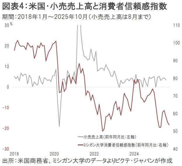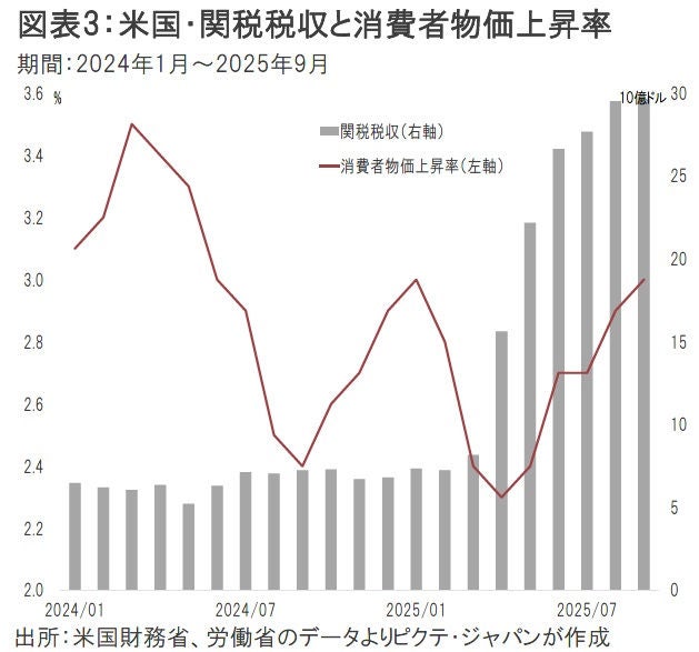 トランプ政権の政策の柱は、移民政策の厳格化、そして関税である。9月の純関税税収は296億7,500万ドルであり、平均的な水準の4.5倍になった(図表3)。それは消費者物価(CPI)を2%ポイント程度押し上げるインパクトであり、4月以降、消費者物価は徐々に上昇ペースを加速している。
