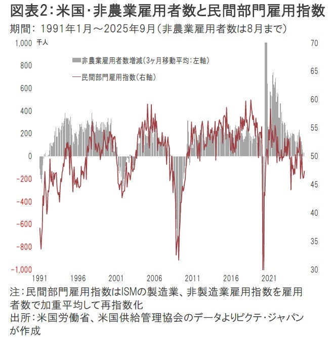 また、米国供給管理協会(ISM)の製造業、非製造業の雇用指数を使って労働市場全体の雇用指数を算出すると、9月は47.4だった。好不調の基準となる50を4ヶ月連続で割り込んでいる。