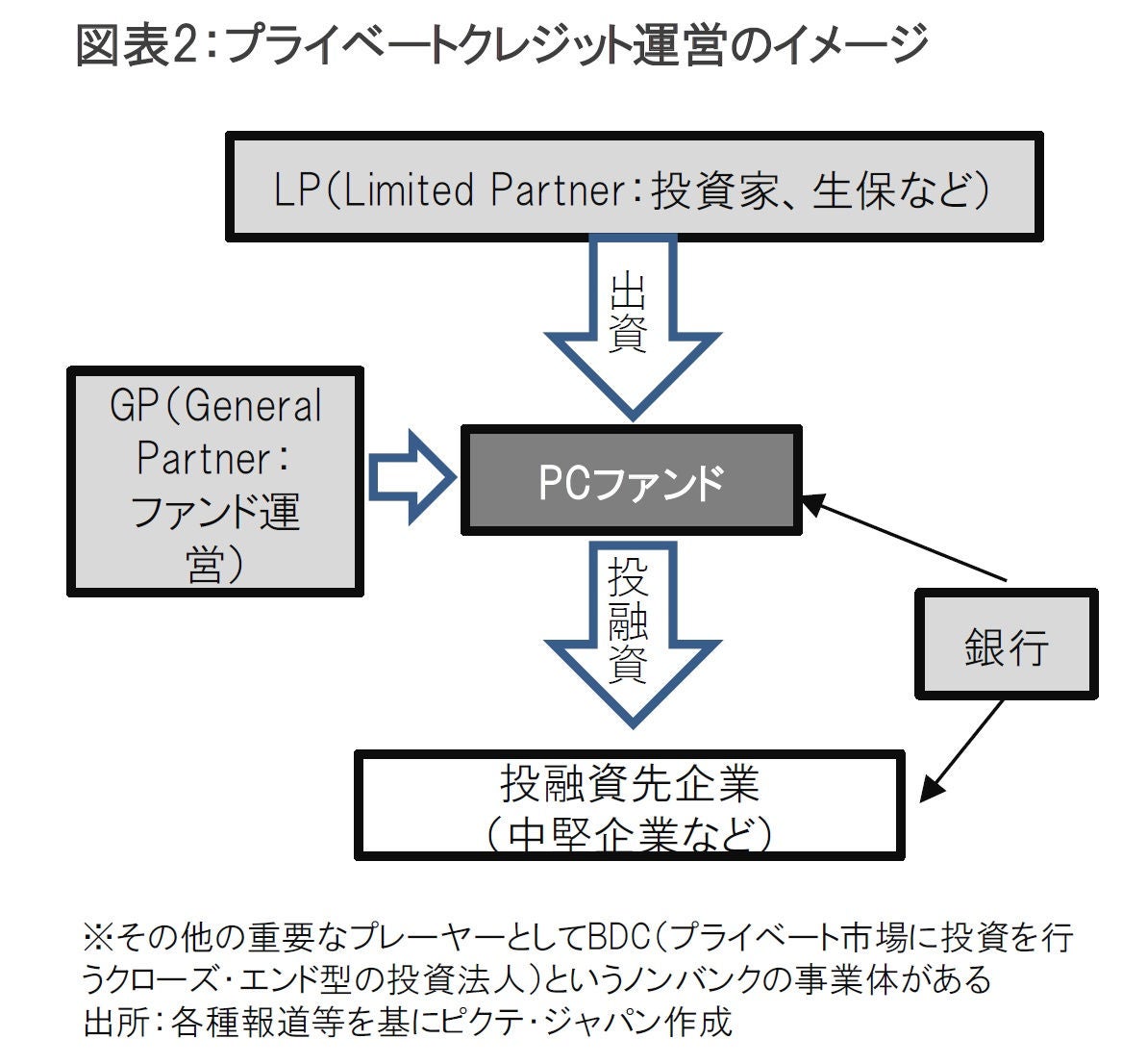 プライベートクレジット(PC)の運営の仕組みをイラストで紹介する(図表2参照)。