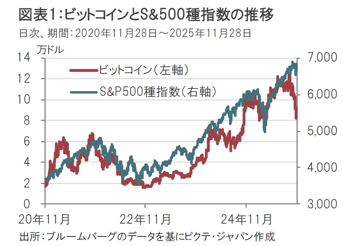 代表的な暗号資産(仮想通貨)であるビットコインの価格は米株式市場、特にハイテク株と連動する傾向が見られる(図表1参照)。投資家の幅が広がり、需給要因などが価格変動を左右することが背景にあると思われる。