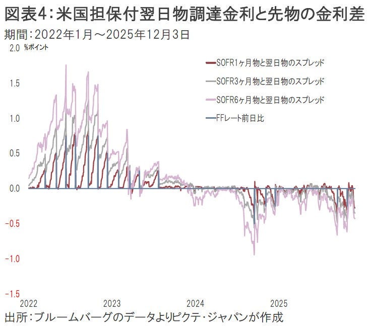12月3日にADPが発表した11月の民間部門雇用統計は、雇用の減速を示す結果だった。担保付翌日物調達金利と先物のスプレッドは、12月8、9日のFOMCにおける利下げをを織り込む水準だ(図表4)。そうしたなか、年明け早々にも次期FRB議長が明らかになるため、マーケットはその人事によるインパクトを探る展開になるだろう。