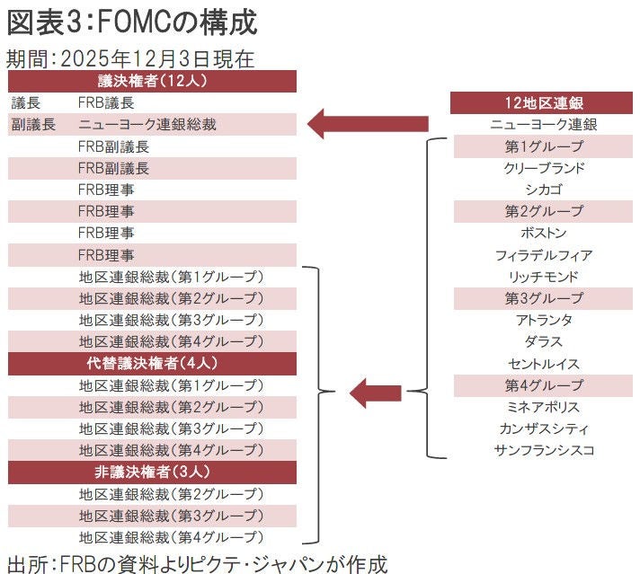 ちなみに、FOMCの参加者は、FRB理事7名と12地区連銀総裁の計19名、このうち投票権を持つのはFRB理事7名、ニューヨーク連銀総裁、そして残り11地区連銀から輪番で4名の計12名だ(図表3)。現在の理事だと、トランプ大統領に近いのは、何れも同大統領に任命されたミッシェル・ボウマン副議長、ミラン、ウォラー両理事の3名だろう。一方、パウエル議長を含め、他の4名は政権と距離がある。また、地区連銀総裁は、各連銀の取締役会が選任し、FRBによって任命されることから、人事に大統領の権限が直接及ぶわけではない。