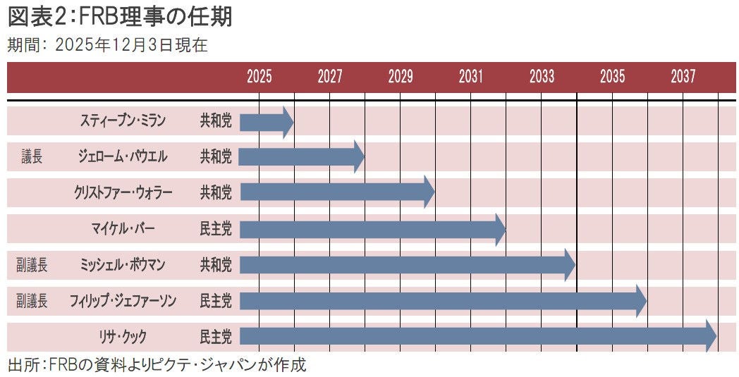 連邦準備制度法によれば、1)理事の任期は前任者の務めた期間を含めて14年、2)議長、副議長は理事のなかから選任、3)議長、副議長の任期は4年だが、退任後も理事としての任期が残っていれば留任可能・・・の3つが法律上の規定だ(図表1)。トランプ大統領が送り込んだミラン理事の場合、辞任したアドリアナ・クグラー前理事の任期を引き継いだため、2026年1月31日で任期切れとなる(図表2)。同理事は、CEA委員長を退任しておらず、FRB理事はトランプ大統領が次の理事を任命するまでのつなぎだろう。