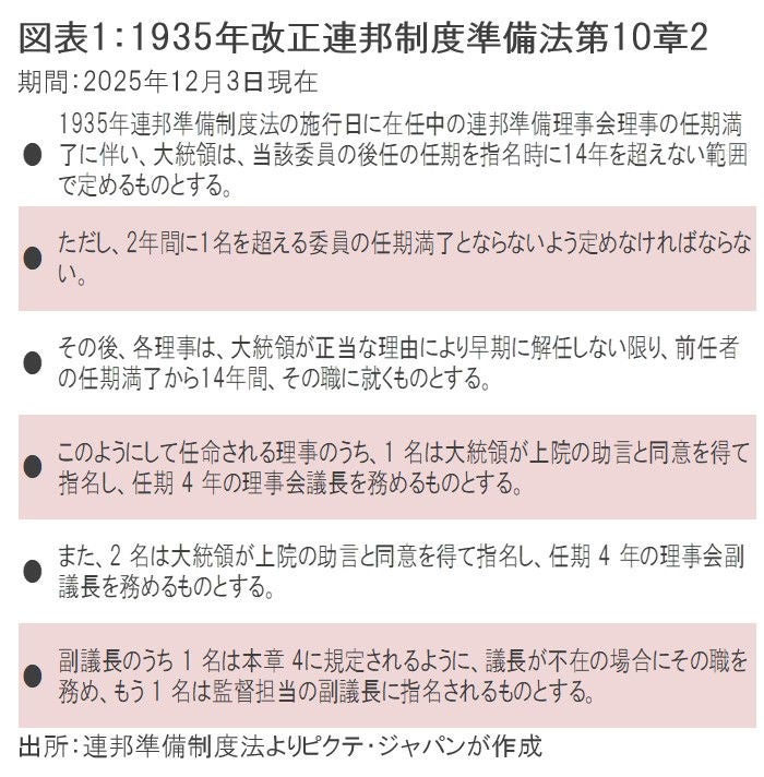 一方、5月に議長の任期を終えるパウエル議長は、理事として2028年1月まで留任可能だ。同議長が慣例を破って議長退任時に理事を辞任しない場合、次期FRB議長を外部から任命するのであれば、トランプ大統領は候補者をミラン理事の後任にしなければならない。