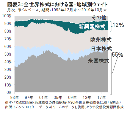 足元では、相対的に景気が安定しているとみられる米国株式市場へ投資資金が流れた結果、世界の株式市場における米国株式の比率(時価総額ベース)は過去からみても高水準に達しています(図表3参照)。