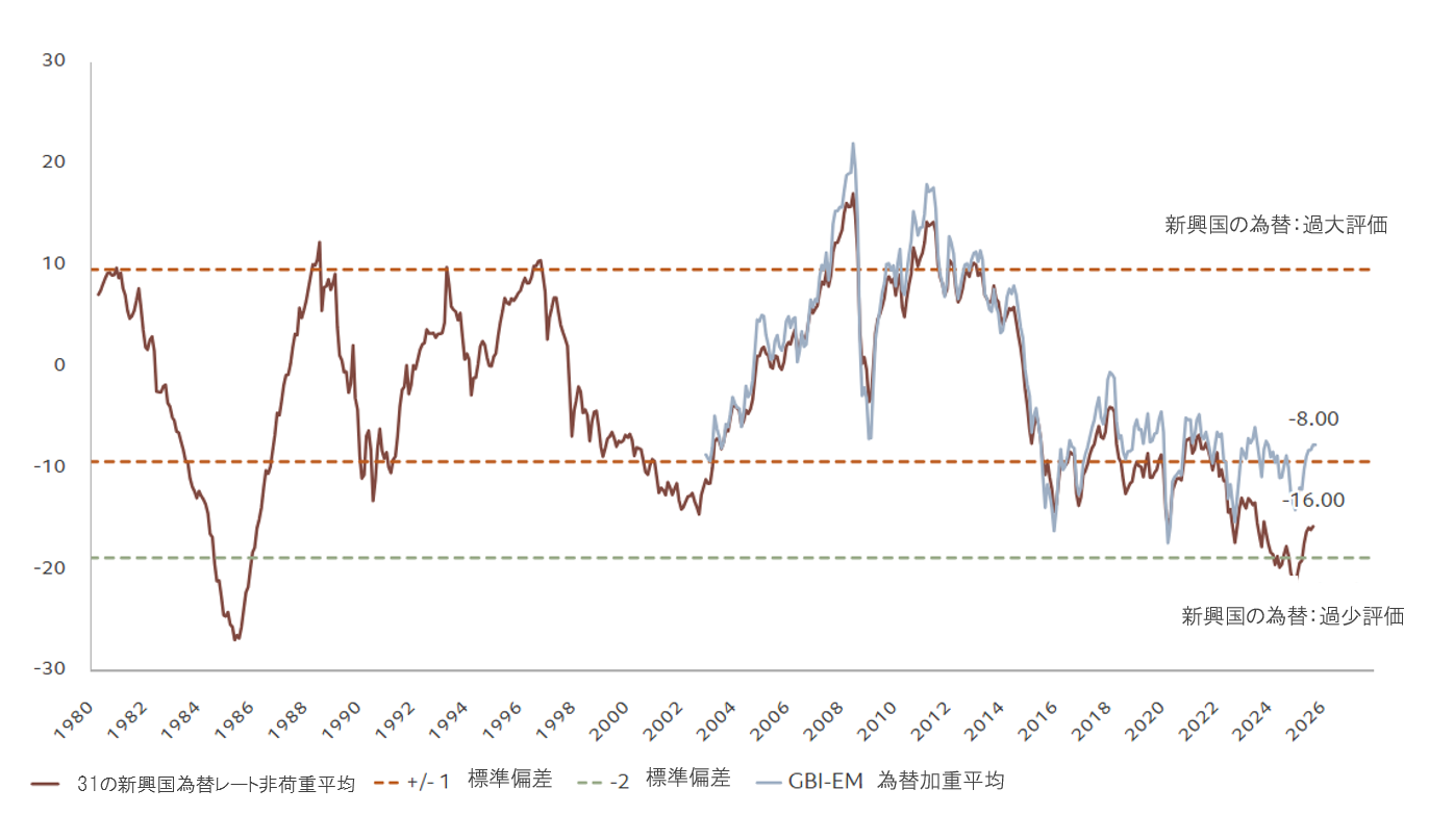 新興国通貨のバリュエーションは、31の新興国為替レートの対米ドル非加重平均に基づきます。均衡は、相対価格、相対生産性、および純対外資産に基づきます。
