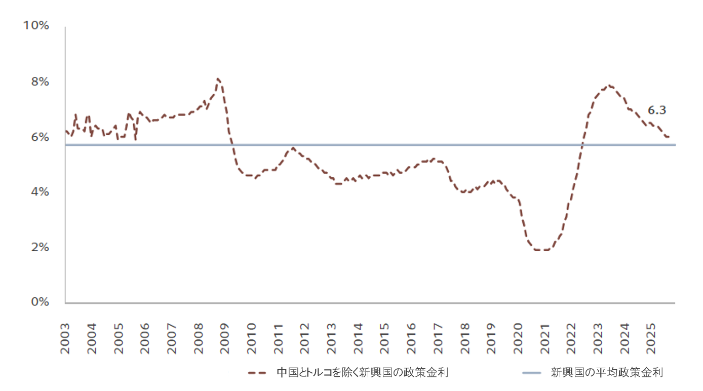 新興国における中央銀行の金融政策は引き締め的ではあるものの、正常化に向かっており、これは新興国債券にとって概ね好ましい組み合わせです。各国政策金利の加重平均は6.3%に低下し、2003年から2008年の期間以来最低となっていますが、それでも当社が推定する中立金利約5.5%を大きく上回っています(図1参照)。経済成長が潜在成長率(約4%)に近い水準で推移し、インフレ率が3%に戻りつつあることから、金融政策の正常化が継続すると予想され、これは債券にとって好材料となります。さらに、実質金利の平均は3%を上回っており、これは歴史的に新興国市場が好調なパフォーマンスと示していた時期に見られた水準です2。