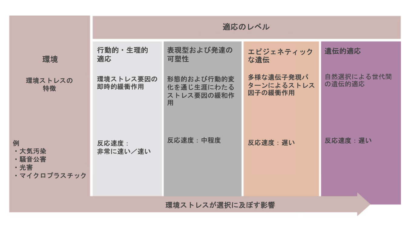 次の適応階層レベル(濃いグレーの箱)では、ショー教授が「表現型可塑性」と呼ぶものが示されています。これらは生理機能や行動における、より長期的な変化です。例えば、定期的な運動によって身体能力を向上させることなどが含まれます。