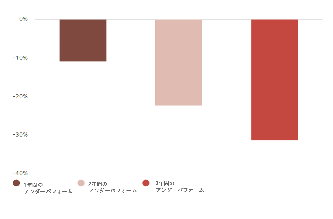 もちろん、アンダーパフォームの確率は株式投資家が直面するリスクの一側面に過ぎません。アンダーパフォームが発生した場合、その大きさもまた重要な要素です。同じ分析で、これまで市場で高いパフォーマンスを示していた銘柄が下落に転じた場合、1年で10~15%の損失を被る可能性があり、アンダーパフォームが3年間続くと30%以上の損失に達する可能性があることがわかりました(図表6)。