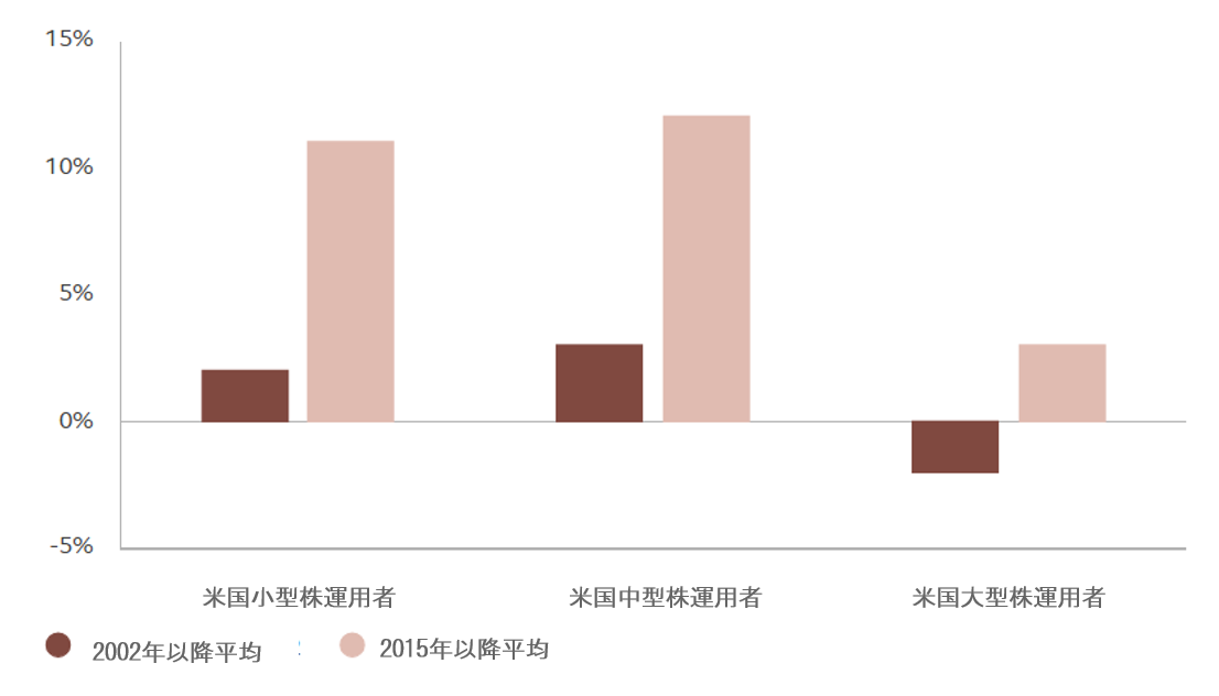 中小型株は、さらに他のメリットももたらします。調査によれば、中小型株に投資する戦略は、大型株に焦点を当てた戦略と比較して、ベンチマークを上回るパフォーマンスを示す傾向があることが示されています(図表8)。その理由の一つとして、これらの株式市場の中でもあまり詳しく調査されていない分野では、投資リサーチがより大きな成果を上げやすいためかもしれません。