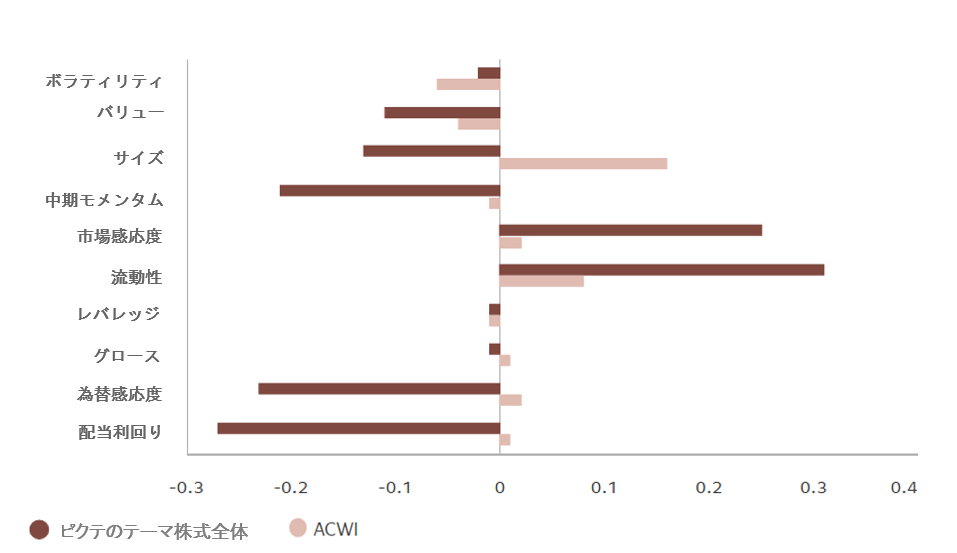 このアプローチは当然のことながら、ピクテのテーマ株式戦略はグローバル株式指数と比較して、異なる投資スタイルに基づくエクスポージャーを持つことを意味します(図表3)。例えば、短期的な要因ではなく、長期的な成長基盤を持つ企業に投資を集中させることで、グローバル株式指数と比較してバリューやモメンタムに関連するエクスポージャーが低くなる傾向があります。
