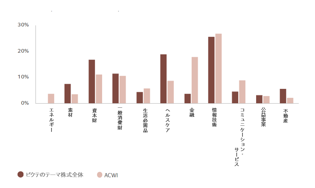 ピクテのテーマ株式全体とMSCI ACWIにおけるセクターシェア(%)