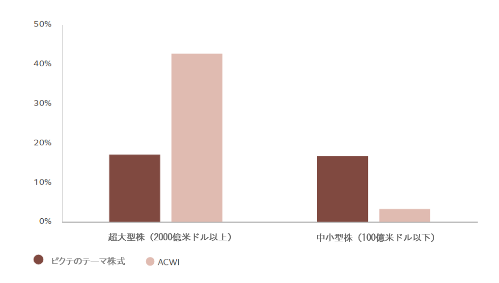 ピクテのテーマ株式とMSCI ACWIにおけるサイズ別シェア(%)
