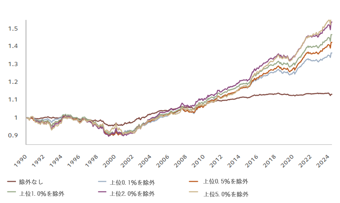 サイズ効果(最大企業を除外した場合)、1990年1月31日を1として指数化