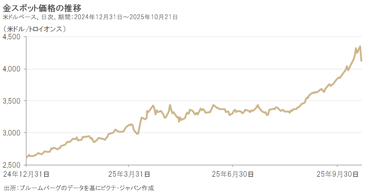 金スポット価格は2025年10月20日に4,356.30米ドル/トロイオンスの過去最高値を付け、2025年年初からの上昇率は66.0%となっていました。特に、2025年8月末から10月20日までの2ヵ月弱の期間の上昇率は26.3%と騰勢を強めていたこともあり、利益確定の動きが強まったことなどが下落の主な背景にあると考えられます。