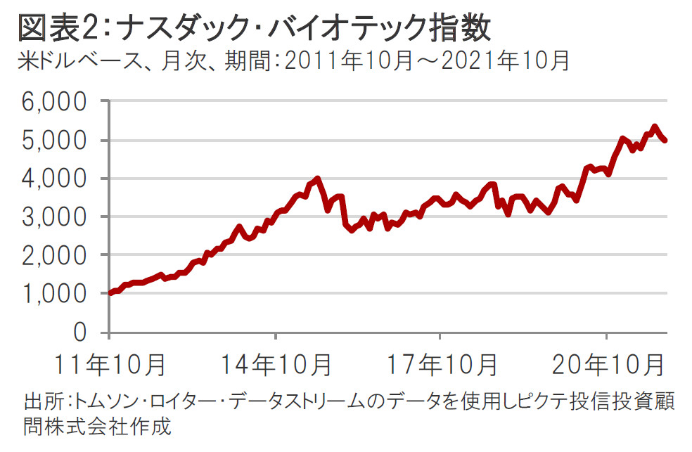 2021年10月のバイオ医薬品市場は、株式市場全体に比べ出遅れる展開となりました。ワクチン製造関連銘柄がその他のバイオ医薬品銘柄と比べて突出して買われる状況は収束していますが、これは、長期的な収益拡大の見通しに欠ける状況がバリュエーション(投資価値評価)を下押し始めたためだと考えます。M&A(合併・買収)は、9月末のメルク(米国)によるアクセレロン・ファーマ(米国)の買収以降、低調な状況が続いていましたが、ブリストル・マイヤーズ・スクイブ(米国)によるオーリニア・ファーマシューティカルズ(カナダ)の買収観測が強まりました。一方で新規株式公開(IPO)については低調でした。また米国議会では、薬価引き下げを巡る議論が続いていますが、実現は難しいことを示唆する状況が相次いでいるように思われます。こうした状況下、小型のバイオ医薬品銘柄は、1年程続いた下落局面から反転底打ちしたように思われます。