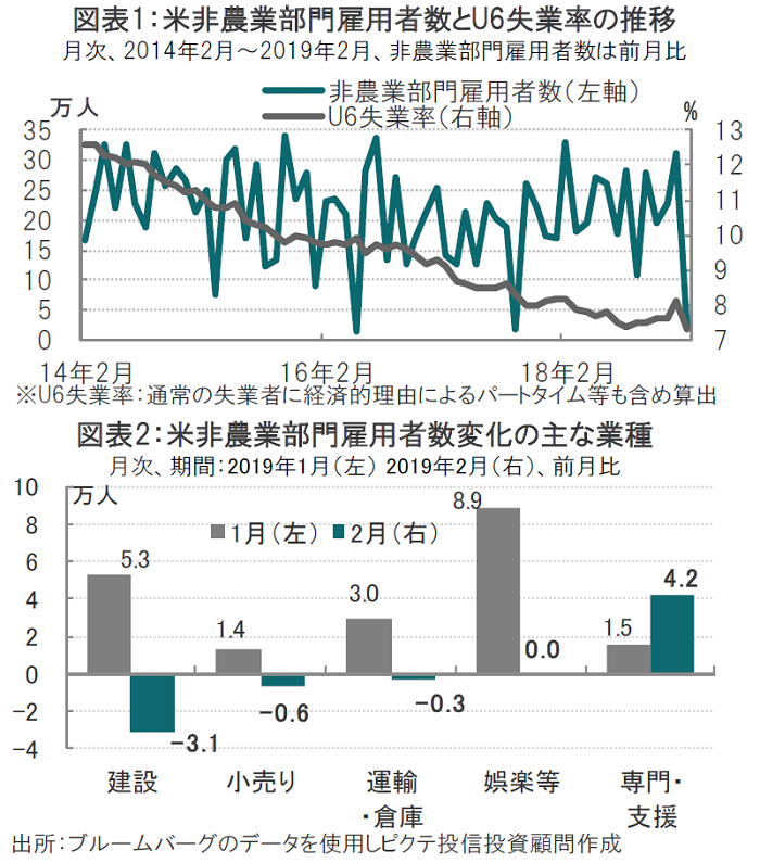 米労働省が2019年3月8日に発表した2月の米雇用統計では、非農業部門雇用者数が前月比2万人増と、市場予想(18万人増)、前月(31万1000人増と速報値30万4000人増から上方修正)を下回り、17年9月(1万8000人)以来の低水準となりました(図表1参照)。