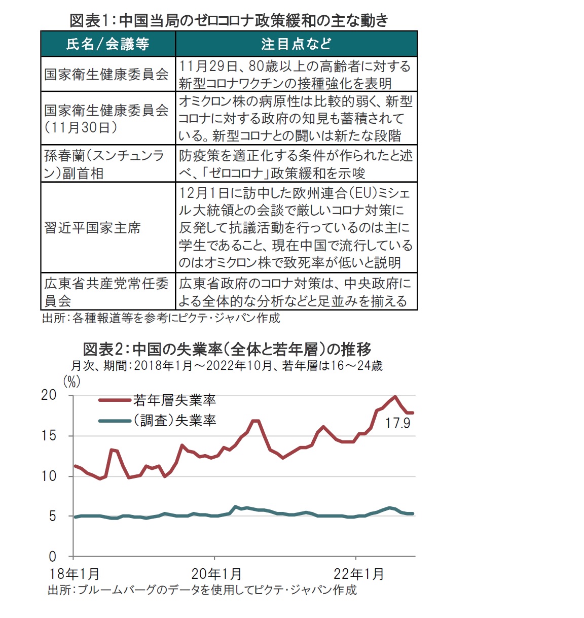中国の景気減速の一つの要因とみられるゼロコロナ政策に見直しの兆しが見られます。中国当局からゼロコロナ政策緩和を示唆するコメントなどが報道されています(図表1参照)。国家衛生健康委員会からは、足元中国に蔓延しているコロナの病原性は比較的弱いことや、今後の政策の重心が新型コロナウイルスのワクチン接種にシフトする可能性が示唆されています。また、広東省の共産党常任委員会の声明から、ゼロコロナ政策の緩和は地域特性を踏まえ対応にばらつきが見られますが、あくまで中央政府と足並みを揃えた(許可を受けた?)対策であることがうかがえます。