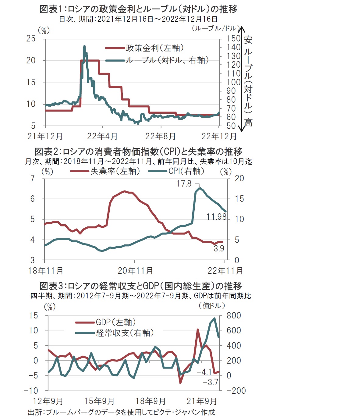 ロシア中央銀行は2022年12月16日、金融政策決定会合を開催し、政策金利を市場予想通り7.50%に据え置くことを決定しました(図表1参照)。