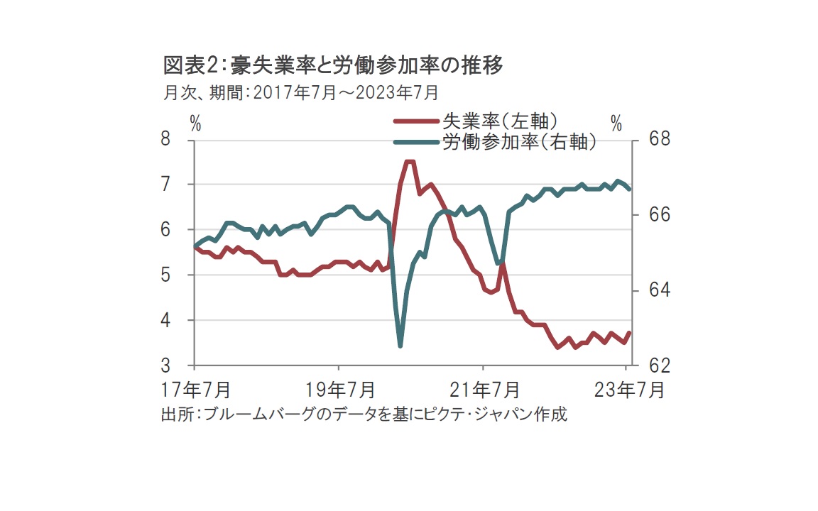豪労働市場の堅調さは賃金上昇を通じて物価上昇要因とみられます。労働市場への参入度合いを示す労働参加率はコロナ禍前を上回り過熱感がある中で、失業率は低水準で(図表2参照)、物価の上方リスク要因とみています。